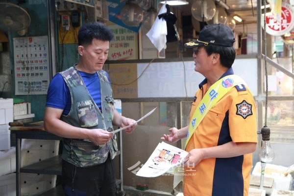 지난 5일 서울 마포소방서는 망원동에 위치한 월드컵시장에서 추석맞이 전통시장 화재예방 캠페인을 벌였다. 사진은 이재옥 서장이 시장상인에게 화재예방 홍보 전단을 건네며 설명하는 모습.(사진제공=마포소방서)
