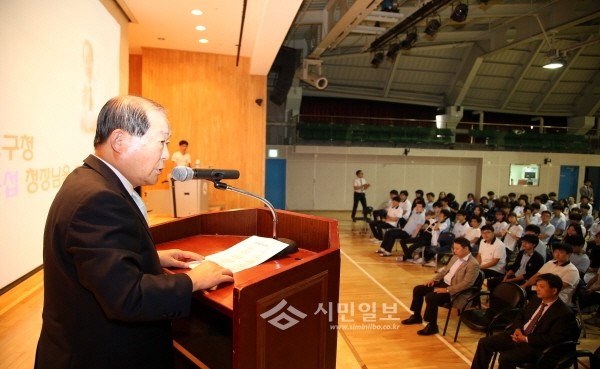 지난 6일 박홍섭 서울 마포구청장은 아현동 한세사이버보안고등학교에서 열린 '서강대학교와 함께 학교로 찾아가는 소프트웨어 특강'에 참석했다. 사진은 박 구청장이 인사말을 전하는 모습.(사진제공=마포구청)