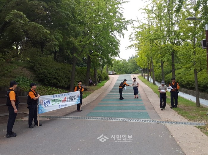 지난 4일 인천중부소방서 119구조대는 월미산 등산로에서 '산악사고 예방 캠페인'을 실시했다. 사진은 소방서 관계자들이 등산객들에게 '산악사고 주의 홍보물'을 배부하는 모습.(사진제공=중부소방서)