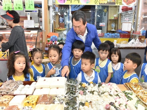 지난 7일 나진구 서울 중랑구청장은 우림시장에서 지역내 국·공립어린이집 25곳의 아이 604명과 함께 진행한 '국공립어린이집 전통시장 장보기 체험활동'에 동참했다. 사진은 나 구청장이 아이들과 함께 장을 보고 있는 모습.(사진제공=중랑구청)