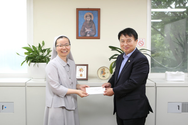 | ▲ 성프란치스꼬 장애인종합복지관을 방문한 박용순 의장이 격려금을 전달하고 있다.(사진제공=구로구의회) | ||