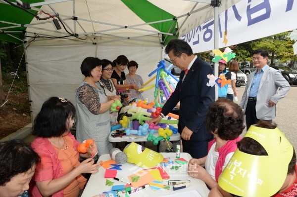 최근 인천 연수구는 구청 상징광장 및 주차장 일원에서 총 3000여명의 주민들과 사회복지 관계자가 참여한 가운데 '제3회 연수구 사회복지 박람회'를 성황리에 개최했다. 사진은 이재호 구청장(가운데)이 박람회 참가자들과 이야기를 나누는 모습.(사진제공=연수구청)