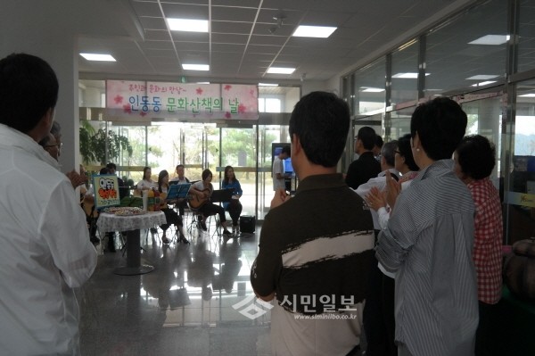 지난 9일 경북 구미시 인동동에서는 동주민센터 로비에서 주민과 문화의 만남이라는 주제로 '인동동 문화산책의 날'을 개최했다. 사진은 행사에 참여한 주민들이 공연을 펼치는 모습.(사진제공=구미시청)