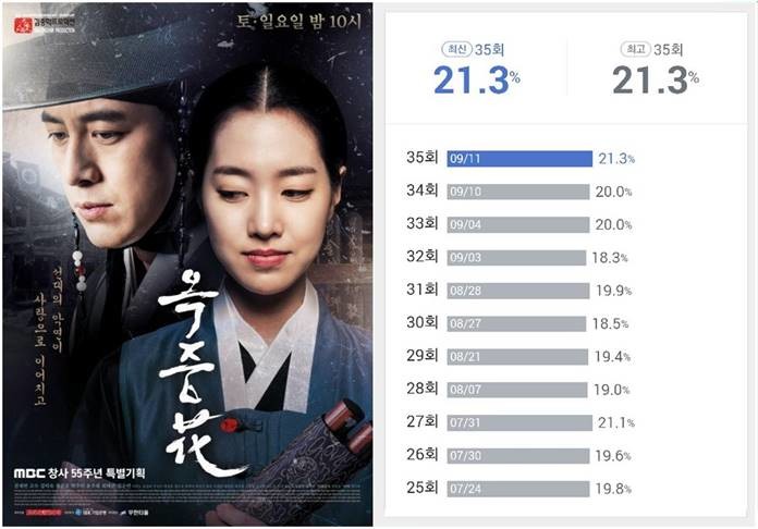 한편, 닐슨코리아 집계에 따르면 ‘옥중화’의 지난 35회 시청률은 전국기준 21.3% 기록해 자체 최고 시청률 달성과 함께 동시간대 시청률 1위의 행진을 이어가고 있다.