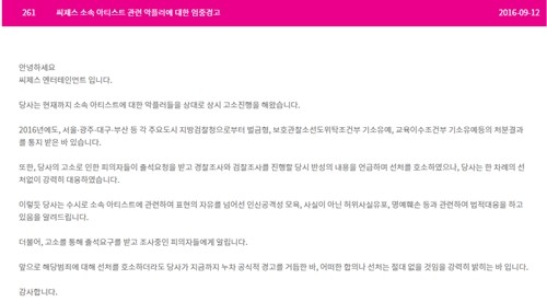 씨제스 엔터테인먼트 측은 13일 공식 홈페이지를 통해 악플러를 상대로 상시 고소한 진행 사실을 알리며 합의나 선처 없이 강력 대응하겠다고 밝혔다.
