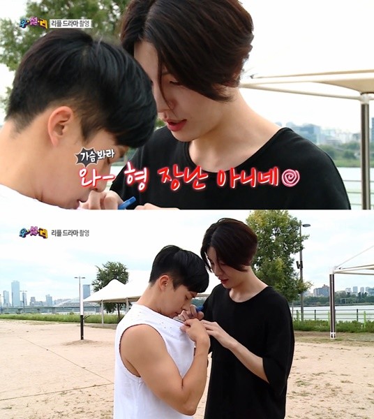 그는 허경환의 옷 사이로 가슴 근육을 살피며 "와 형 장난 아니네"라며 감탄을 자아냈다.