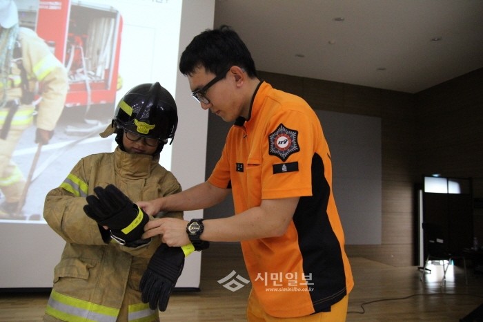 최근 경기 화성소방서는 진안중학교 1학년 학생 28명을 대상으로 미래소방관 직업체험교실을 운영했다. 사진은 소방관이 학생에게 화재진압 복장 착용에 대한 교육을 하는 모습.(사진제공=화성소방서)