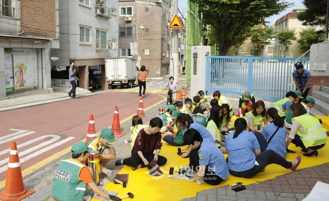 최근 서울 광진구는 구의2동에 위치한 광진초등학교 앞 통학로에 학부모, 학생, 교사 등 30여명과 함께 교통사고 예방시설물인 ‘옐로카펫’을 깔았다. 사진은 행사에 참여한 학부모 및 학생 등이 옐로카펫을 설치하는 모습. (사진제공=광진구청)
