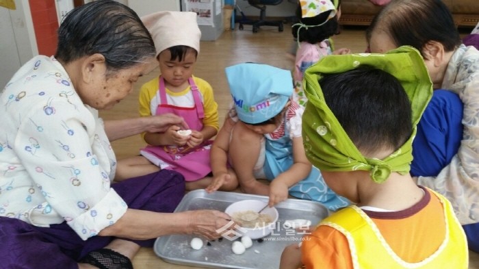 지난 13일 서울 금천구는 시흥4동 장수경로당에서 경로당 노인들과 구립 튼튼이 어린이집 어린이들이 함께 하는 ‘송편 만들기 행사’를 개최했다. 사진은 행사에 참여한 어린이와 노인들이 송편을 만드는 모습.(사진제공=금천구청)