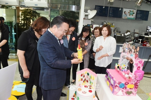 최근 경기 양주시 어린이집연합회는 시청 1층 로비와 지하대회의실에서 어린이집 보육교직원 380여명을 대상으로 '2016년 보육교직원 교재교구전 및 동화구연대회'를 개최했다. 사진은 이성호 시장이 전시된 교구를 살펴보는 모습.(사진제공=양주시청)