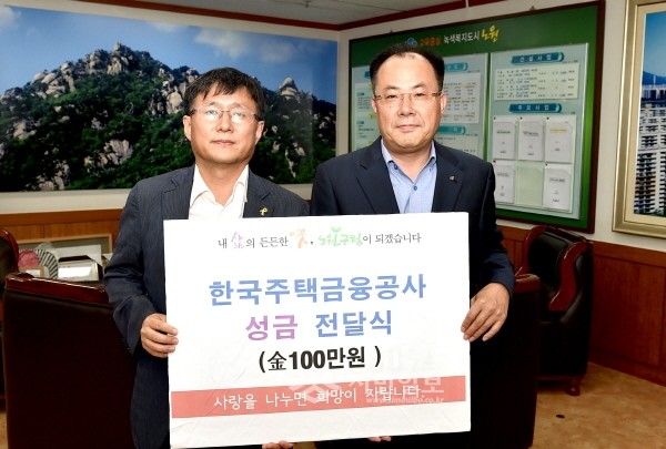 최근 한국주택금융공사 서울북부지사는 추석을 맞아 지역내 저소득 주민들을 위해 써달라며 '사랑의 성금' 100만원을 서울 노원구에 기탁했다. 사진은 김성환 구청장(왼쪽)과 관계자가 기념촬영하는 모습.(사진제공=노원구청)