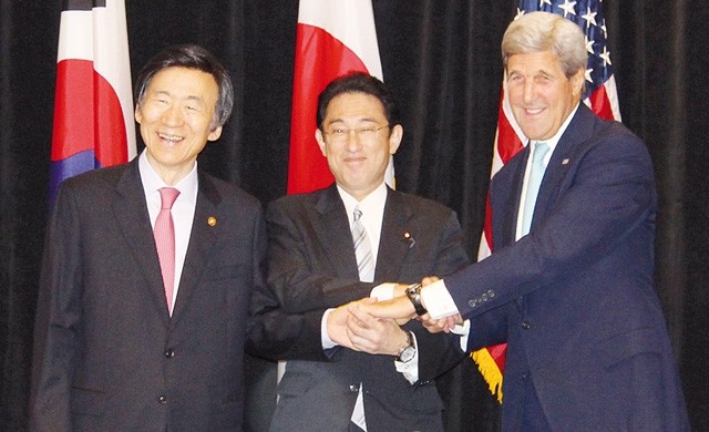우리나라의 윤병세 외교장관(왼쪽부터)과 기시다 후미오 일본 외무상, 존 케리 미 국무장관이 18일(현지시간) 미국 뉴욕 매리엇 이스트 사이드 호텔에서 회담하고 북한의 도발에 강하게 대응하기로 의견을 모았다