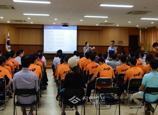 20일 서울 영등포소방서는 4층 강당에서 외래강사를 초청해 '청렴·친절 문화 정착을 위한 교육을 실시했다. 사진은 강사가 소방서 관계자들에게 교육을 진행하는 모습.(사진제공=영등포소방서)