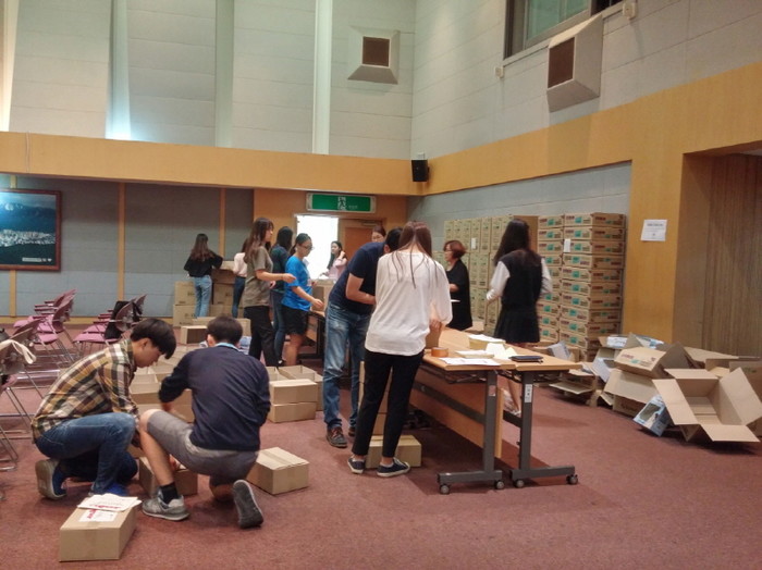 최근 도봉구는 구청 대강당에서 고등학생·대학생으로 구성된 자원봉사자 12명과 함께 저소득 여성청소년 457명에게 제공할 제2차 위생용품 지원상자를 제작했다. 사진은 관계자들이 지원상자를 제작하고 있는 모습.(사진제공=도봉구청)