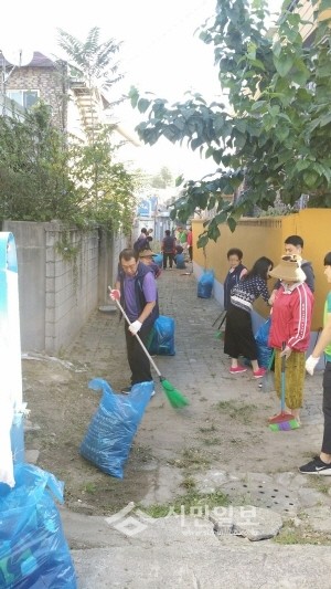 경기 동두천시 중앙동 주민센터는 지난 20일 오전 7~9시 중앙동 14통 환경취약지역을 정비했다. 사진은 환경정비 활동에 참여한 관계자들이 빗자루로 잡초를 제거하는 모습.(사진제공=동두천시청)