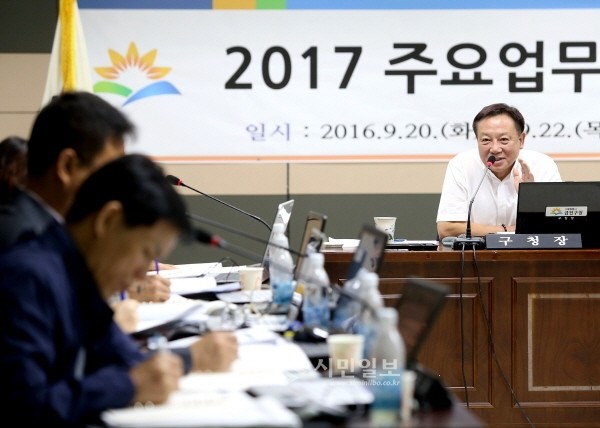 서울 금천구는 22일까지 내년 업무계획에 대한 사업 타당성 및 예산 효율성 검증을 위한 2017년 주요업무계획 보고회를 진행한다. 사진은 21일 차성수 구청장이 구청 간부들에게 인사말을 하는 모습.(사진제공=금천구청)