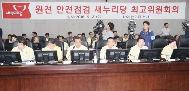 21일 오후 경북 경주시 한국수력원자력 본사에서 열린 새누리당 원자력발전 안전점검 현장 최고위원회의에서 이정현 대표 등 지도부가 원전현황을 보고받고 있다.
