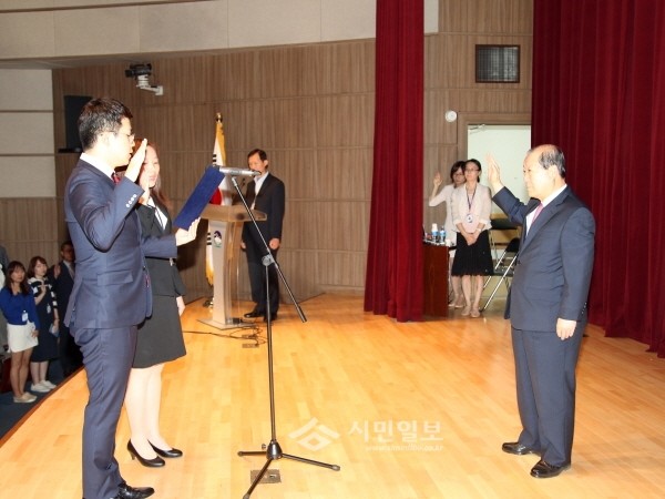 최근 서울 마포구는 청탁금지법 시행을 앞두고 구청 대강당에서 '청탁금지법 시행 관련 전직원 청렴특강'을 열었다. 사진은 박홍섭 구청장(오른쪽)이 직원 대표와 함께 '청탁금지법 준수 서약'을 하는 모습.(사진제공=마포구청)