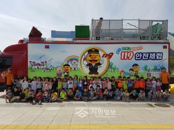 지난 21일 서울 은평소방서는 수색역 광장에서 수색초등학교 학생 및 지도교사 200여명을 대상으로 '이동안전체험교실'을 운영했다. 사진은 교육에 참여한 어린이들이 소방관들과 기념촬영을 하는 모습.(사진제공=은평소방서)