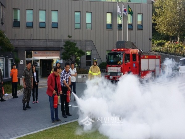 민원인들과 화재 제압 훈련