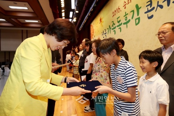 지난 21일 서울 송파구청 대강당에서 책을 매개로 가족의 결속을 다지고 책 읽는 사회문화를 전파하기 위해 개최된 ‘전국 가족독후감 콘서트’에 참석한 박춘희 구청장이 시상식에서 수상자에게 상장을 건네고 있다.(사진제공=송파구청)