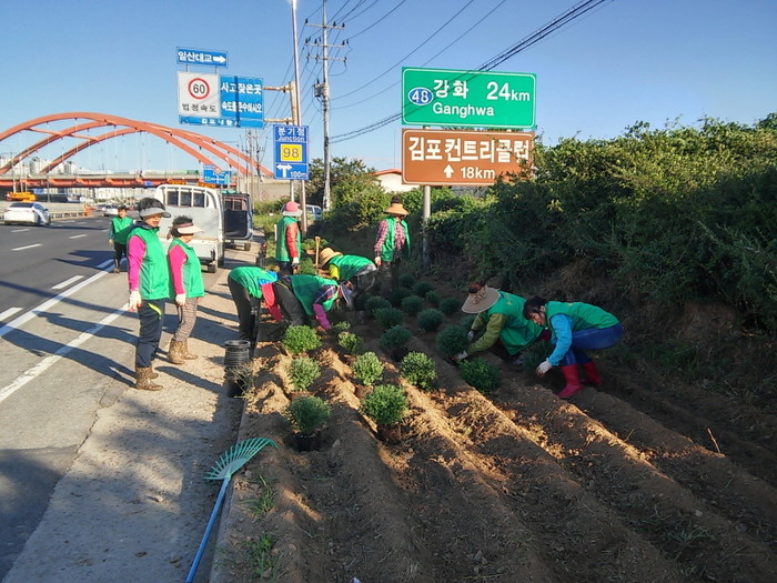 지난 20일 경기 김포시 운양동 남녀새마을지도자회는 회원 20명이 모여 48호 국도변 가로화단에 가을꽃 국화 350본을 식재했다. 사진은 회원들이 꽃을 심고 있는 모습.(사진제공=김포시청)