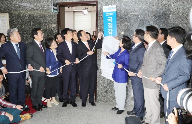 새누리당 정진석 원내대표(왼쪽 뒤)가 22일 오후 국회 본회의장에서 더불어민주당과 정의당에 의해 해임 결의안이 제출된 김재수 농림축산식품부 장관(왼쪽 앞)을 국민의당 안철수 전 공동대표(오른쪽)에게 데려가 인사시키고 있다. 야3당은 원내수석들의 협의로 김재수 장관의 해임결의안을 21일 제출하기로 돼 있었지만 국민의당이 불참해 더민주와 정의당만 결의안을 제출했다.