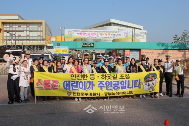 인천중부경찰서는 지난 22일 영종도에 있는 하늘초등학교에서 경찰서 교통안전계, 중부연합녹색어머니회, 모범운전자 등 50명과 교장 및 학생들이 참석한 가운데 '안전한 통학로 만들기' 캠페인을 실시했다. 사진은 관계자들이 기념촬영을 하는 모습.(사진제공=인천중부경찰서)