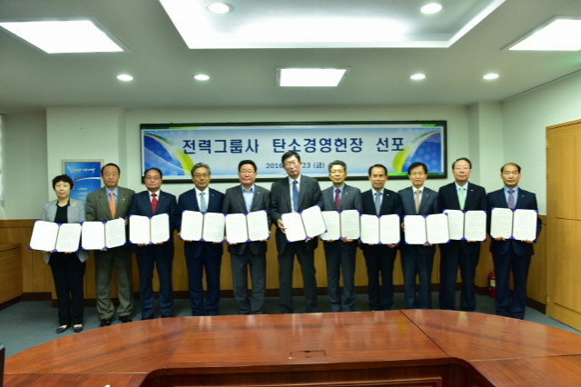 전력그룹사는 탄소경영 추진을 위해 ‘Global Clean Energy Leader’ 라는 비전과 ‘혁신적 탄소 감축, 깨끗하고 안전한 전력공급’ 이라는 미션을 담은 탄소경영헌장 선포를 통해 에너지분야 리더쉽 발휘, 탄소경영을 통한 사회적 책임이행을 결의했다.