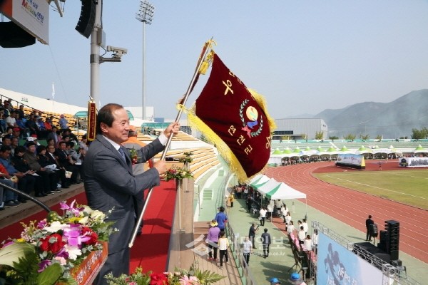 지난 24일 경기 연천군은 연천공설운동장에서 김규선 군수를 비롯해 이종만 군의장 및 주민 등 3000여명이 참석한 가운데 '제48회 연천군민의 날 기념행사 및 체육대회'를 성황리에 마쳤다. 사진은 김 군수가 기념기를 흔드는 모습.(사진제공=연천군청)