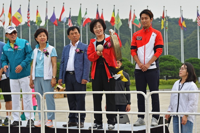 최근 송파구 올림픽공원 평화의 문 광장에서 1000여명의 선수가 하프와 10km, 5km로 나눠 출발해 구 일대를 달리는 ‘제5회 송파구청장배 한성백제마라톤대회’ 개회식에 참석한 박춘희 구청장이 마라톤 시작을 알리는 징을 치고 있다.(사진제공=송파구청)