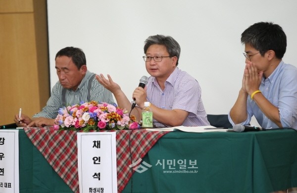 지난 26일 경기 화성시가 지속가능한 공동체 조성을 위해 협성대학교 이공관 대강당에서 '마을과 도시 열린 컨퍼런스’를 개최했다. 사진은 채인석 시장(가운데)이 발언하는 모습.(사진제공=화성시청)