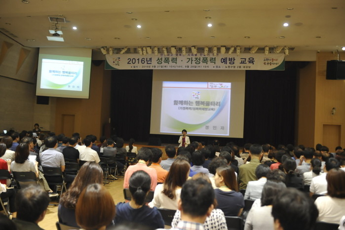 27일 노원구는 구청 대강당에서 전직원을 대상으로 안전하고 행복한 사회를 만들기 위한 '성폭력·가정폭력 예방 교육'을 실시했다. 사진은 직원들이 교육을 받고 있는 모습.(사진제공=노원구청)