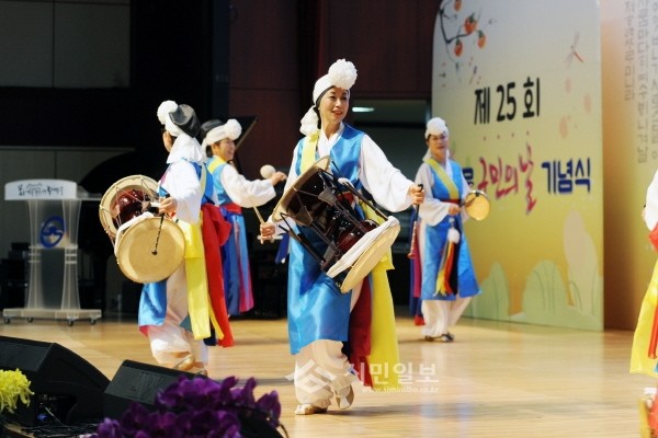 지난 27일 서울 동대문구는 구청 다목적강당에서 '제25회 동대문구민의 날 기념행사'를 개최했다. 사진은 자치회관 프로그램 수강생들이 풍물놀이 공연을 하는 모습.(사진제공=동대문구청)