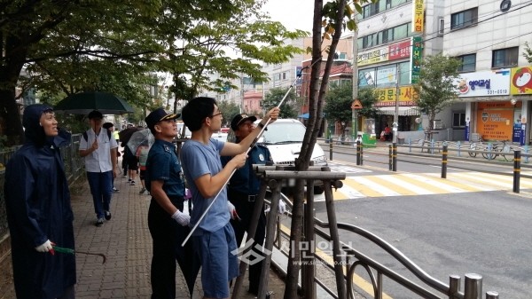 최근 경기 안산시 부곡동이 부곡파출소와 협업으로 불법 현수막 집중 정비를 위한 특별 정비반을 편성했다. 사진은 정비반이 나무에 불법으로 설치된 현수막 끈을 제거하고 있는 모습.(사진제공=안산시청)