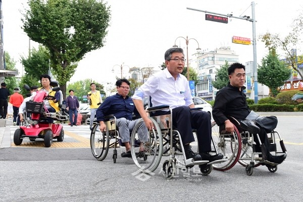 최근 경기 여주시는 한글시장과 강변길 일대에서 시 공무원 20여명과 여주시장애인복지관, 여주시자립생활지원센터 관계자들과 함께 장애인 이동편의 증진을 위한 ‘여주시 공무원 장애체험’을 실시했다. 사진은 원경희 시장(가운데)이 휠체어를 타는 모습.(사진제공=여주시청)