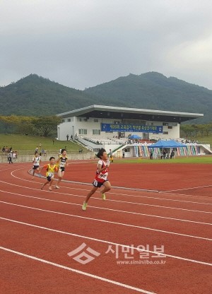 제26회 전라남도교육감기 학년별 육상경기대회가 최근 전남 해남군 우슬경기장에서 열렸다. 사진은 대회에 참여한 학생들이 바통을 들고 열심히 달리는 모습.(사진제공=전남도교육청)