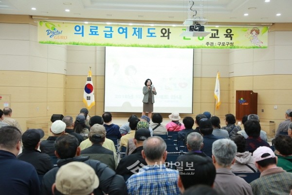 지난 28일 서울 구로구가 의료급여 신규 취득자 200명을 대상으로 실시한 ‘하반기 의료급여 제도 및 가정폭력예방 교육’ 참가자들이 박진영 의료급여관리사의 강의를 듣고 있다.(사진제공=구로구청)