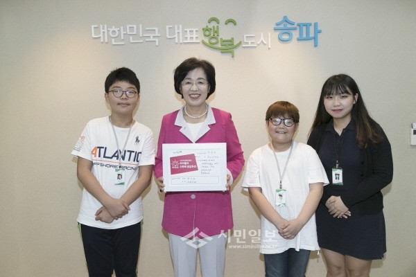 최근 박춘희 서울 송파구청장이 초록우산어린이재단 서울지역본부가 아동학대에 대한 사회적 관심을 높이기 위해 마련된 ‘2016 아이누리 프로젝트 아동학대예방 서명릴레이’에 참석했다. 사진은 서명서를 들고, 아이누리 기자단과 함께 기념촬영을 하고 있는 박 구청장의 모습.(사진제공=송파구청)
