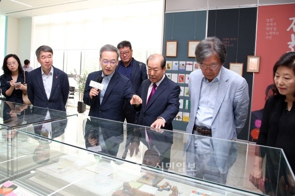 최근 박홍섭 서울 마포구청장은 상암동 푸르메재단 넥슨어린이재활병원 1층 열린예술치료실에서 열린 '푸르메를 사랑한 작가초대전 오프닝 행사'에 참석했다. 사진은 정호승 시인(왼쪽에서 세번째)이 박 구청장(가운데) 등 참석자들에게 전시 작품들을 설명하는 모습.(사진제공=마포구청)