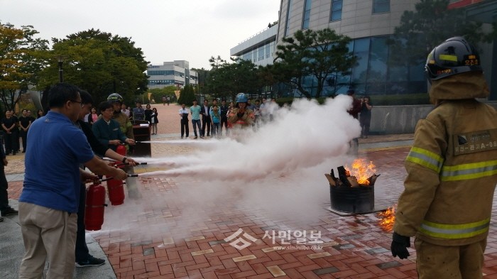 최근 경기 이천시는 청사 화재 예방과 대응력 강화를 위해 시의회·이천소방서와 합동으로 소방훈련을 실시했다. 사진은 훈련 참가자들이 소방안전훈련의 일환으로 소화기 분사체험을 하고 있는 모습.(사진제공=이천시청)