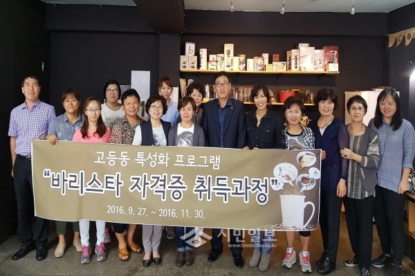 최근 경기 수원시 팔달구 고등동은 주민들을 대상으로 동 특성화 사업으로 선정된 '바리스타 자격증 취득과정' 개강식을 열었다. 사진은 개강식에 참여한 관계자들이 기념촬영하는 모습.(사진제공=팔달구청)
