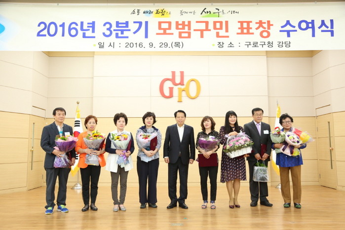 최근 구로구청강당에서 161명의 주민들을 대상으로 실시된 ‘2016년 3분기 모범구민 표창식’에 참석한 이성 구청장(가운데)이 표창을 받은 주민들과 함께 기념촬영을 하고 있다.(사진제공=구로구청)