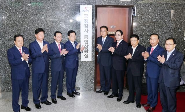 새누리당 정진석 원내대표를 비롯한 원내지도부가 4일 오전 국회에서 뒤늦은 국정감사 종합상황실 현판식을 하고 있다. 왼쪽부터 이우현, 김명연, 김도읍 원내수석부대표, 김광림 정책위의장, 정 원내대표, 박명재 사무총장, 박맹우, 박덕흠, 이채익.