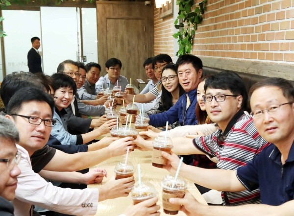 지난 4일 정찬민 경기 용인시장은 '도시락 情모'의 일환으로 처인구 모현면 용인정수장을 방문해 정수과 직원 20명과 점심식사를 함께했다. 사진은 정 시장(오른쪽에서 네 번째)과 관계자들이 기념촬영하는 모습.(사진제공=용인시청)