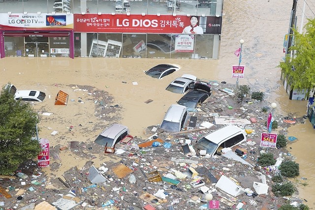 태풍 차바의 영향으로 울산에 300㎜가 넘는 폭우가 쏟아지면서 곳곳이 침수됐다. 중구 우정동의 한 슈퍼마켓 주차장에 차량 10여대와 냉장고 등 가전제품이 둥둥 떠 있다.