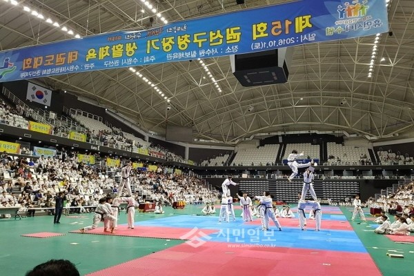 최근 경기 수원시 권선구는 서수원칠보체육관에서 수원시태권도협회 권선구지부 주관으로 '제15회 권선구청장기 생활체육 태권도대회'를 개최했다. 사진은 대회에 참여한 선수들이 종합시범을 선보이는 모습.(사진제공=권선구청)