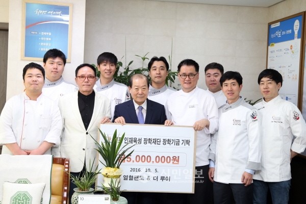 지난 5일 중국음식 셰프들의 모임인 '열혈팬도'와 중국음식점 '더루이'가 서울 마포구 마포인재육성장학재단에 장학기금으로 500만원을 기탁했다. 사진은 구청 접견실에서 박홍섭 구청장(가운데)과 관계자들이 기념촬영하는 모습.(사진제공=마포구청)