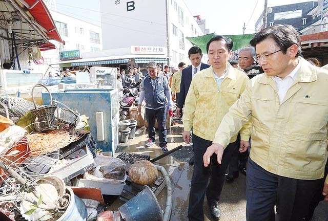 황교안 국무총리가 6일 오전 태풍 피해지역인 울산광역시 태화종합시장을 방문, 현장을 둘러보고 있다.
