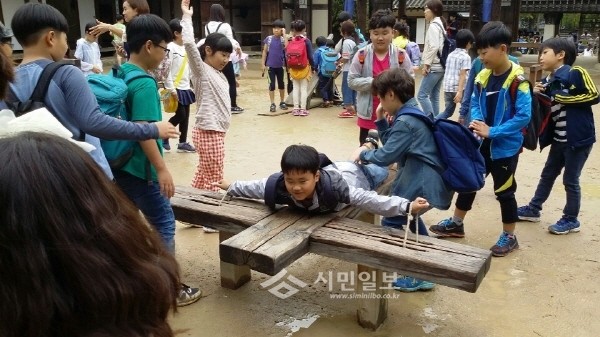 지난 5일 경기 가평군 청평초등학교 3학년 학생들이 경기 용인시에 위치한 한국민속촌으로 1일형 주제별 체험학습을 다녀왔다. 사진은 한 학생이 곤장대 체험을 하고 있는 모습.(사진제공=청평초등학교)